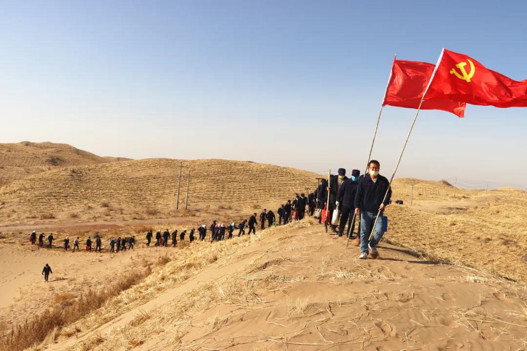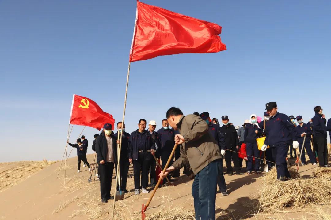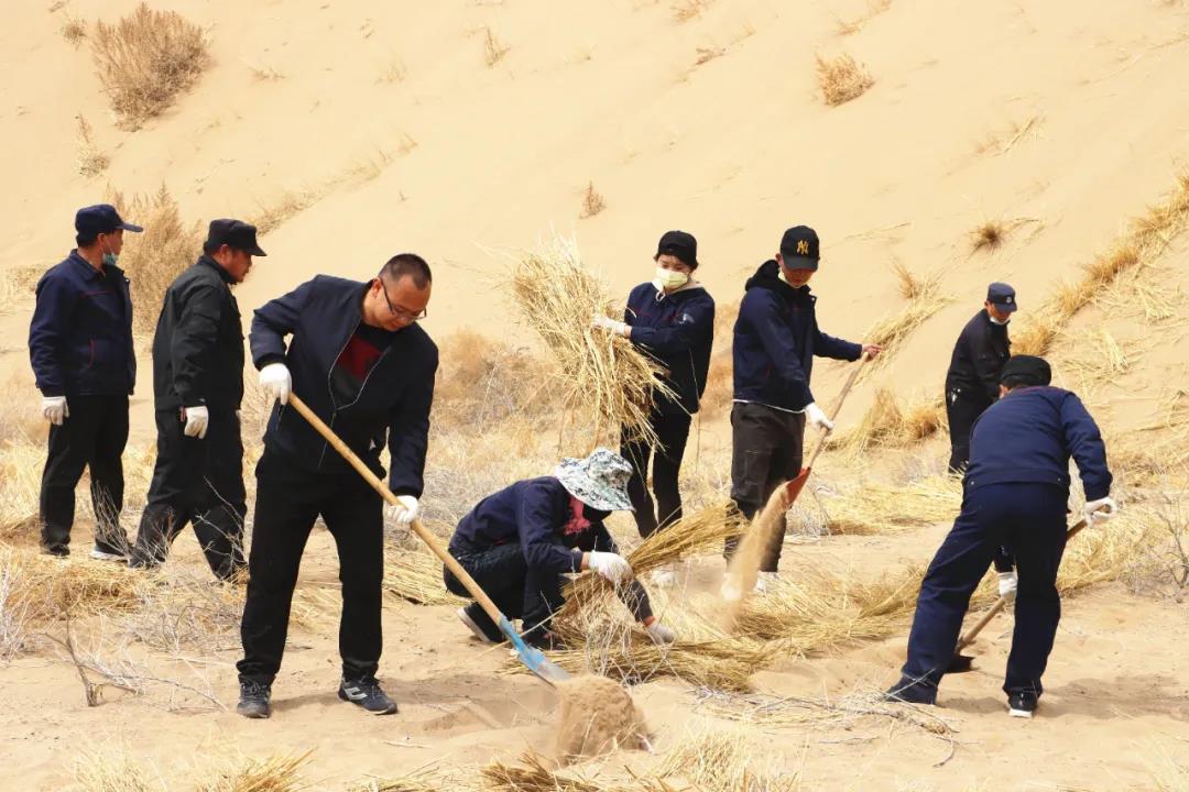一大早,職工們在皇臺酒業(yè)總經(jīng)理楊利兵的帶領(lǐng)下,精神飽滿地趕赴至涼州區(qū)榮生路紅水河榮華大橋向東21公里處的治沙現(xiàn)場。