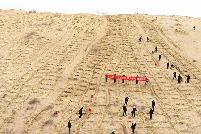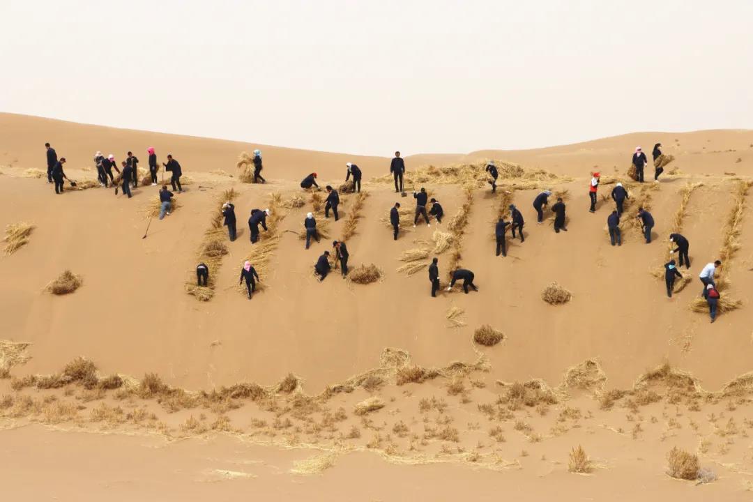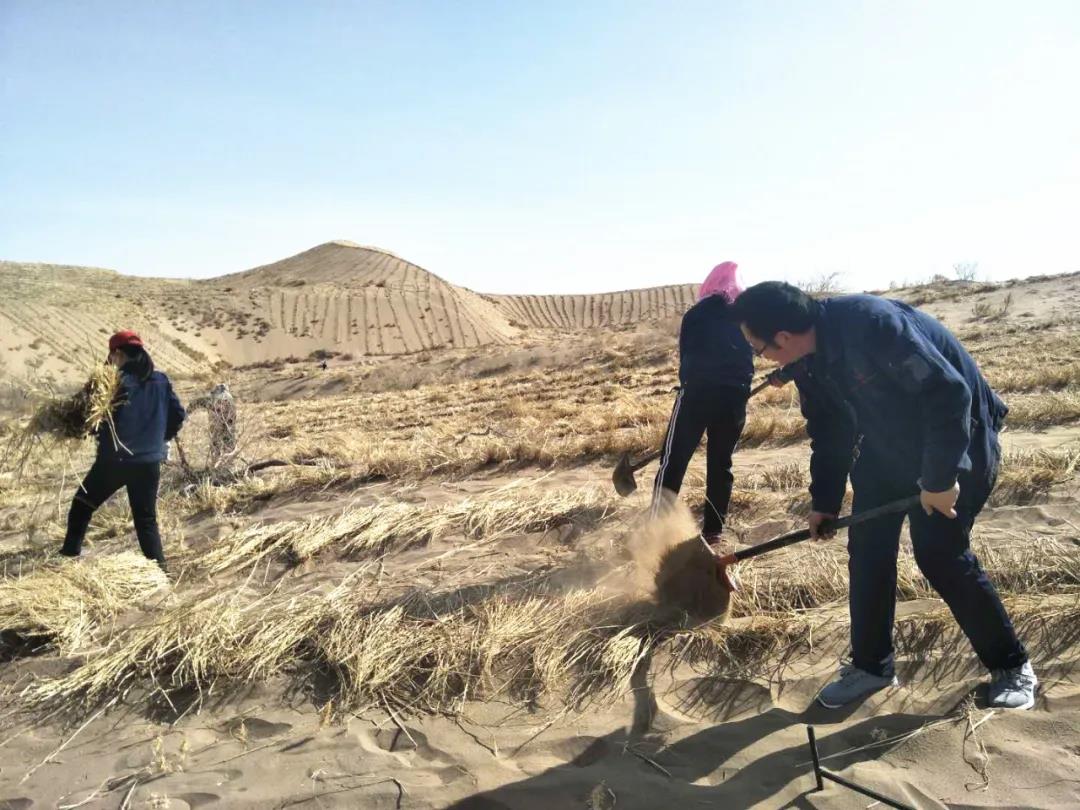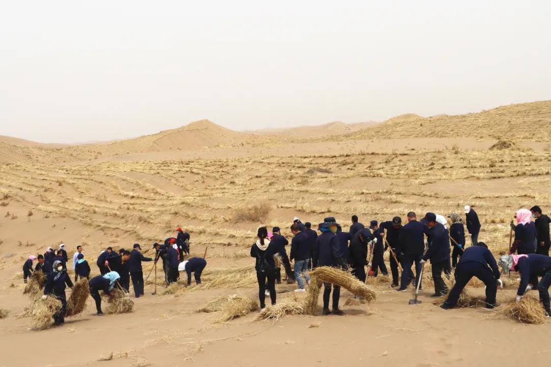 “壓沙前,先要在沙丘上按設(shè)置方向、間距或網(wǎng)格劃好設(shè)置線。背風(fēng)坡,壓豎道;迎風(fēng)坡,就要橫豎格子全壓。先開寬25厘米、深20厘米的沙溝,將稻草在沙溝上均勻無間斷鋪好,再將沙子壓實在稻草中間,將兩邊翹起的稻草用沙淤起與沙面垂直,扶成“雙眉式”……大家仔細(xì)聆聽了區(qū)林草局技術(shù)人員的詳細(xì)講解和指導(dǎo)后,很快掌握了規(guī)范的壓沙方法和要求,各小組迅速投入到熱火朝天的防沙壓沙活動中。