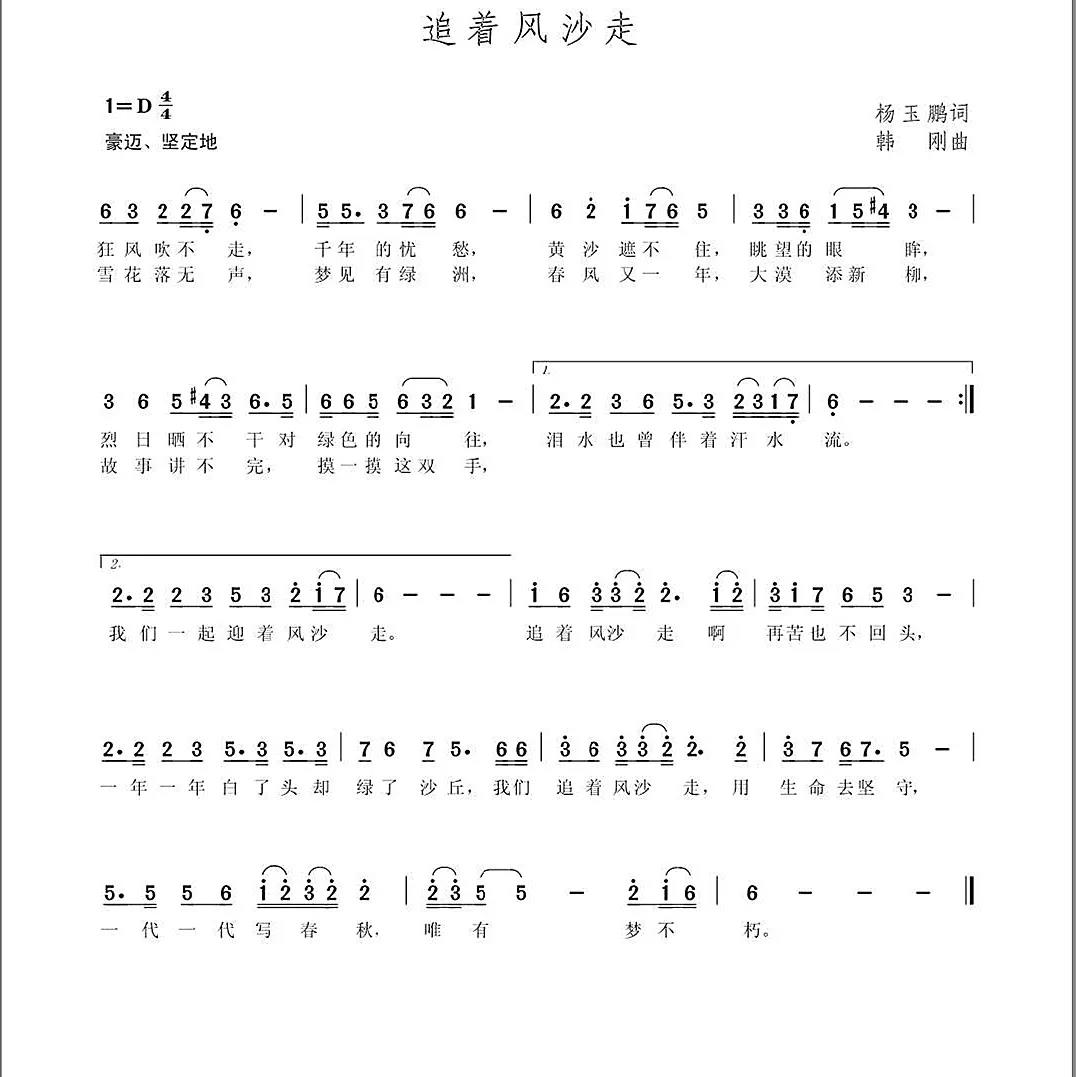 (一)《追著風(fēng)沙走》:作詞,楊玉鵬,青年詞作家,甘肅武威人。代表作品:《甘肅老家》(印青曲)、《土豆花兒開》(韓剛曲)等。