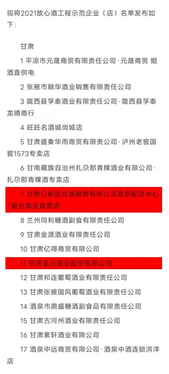 12月中旬,2021中國酒類流通酒類流通協(xié)會放心酒工程示范企業(yè)(店)名單發(fā)布,甘肅皇臺酒業(yè)股份有限公司和甘肅日新皇臺酒銷售有限公司直營配送中心·皇臺酒業(yè)直營店雙雙榮登2021年中國酒類流通協(xié)會放心酒工程示范企業(yè)(店)榮譽殿堂。